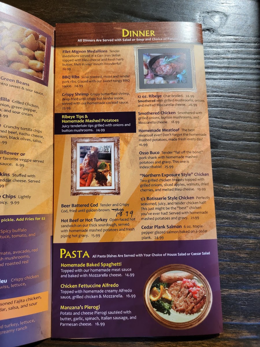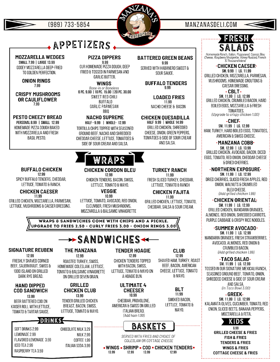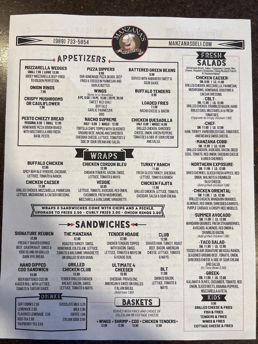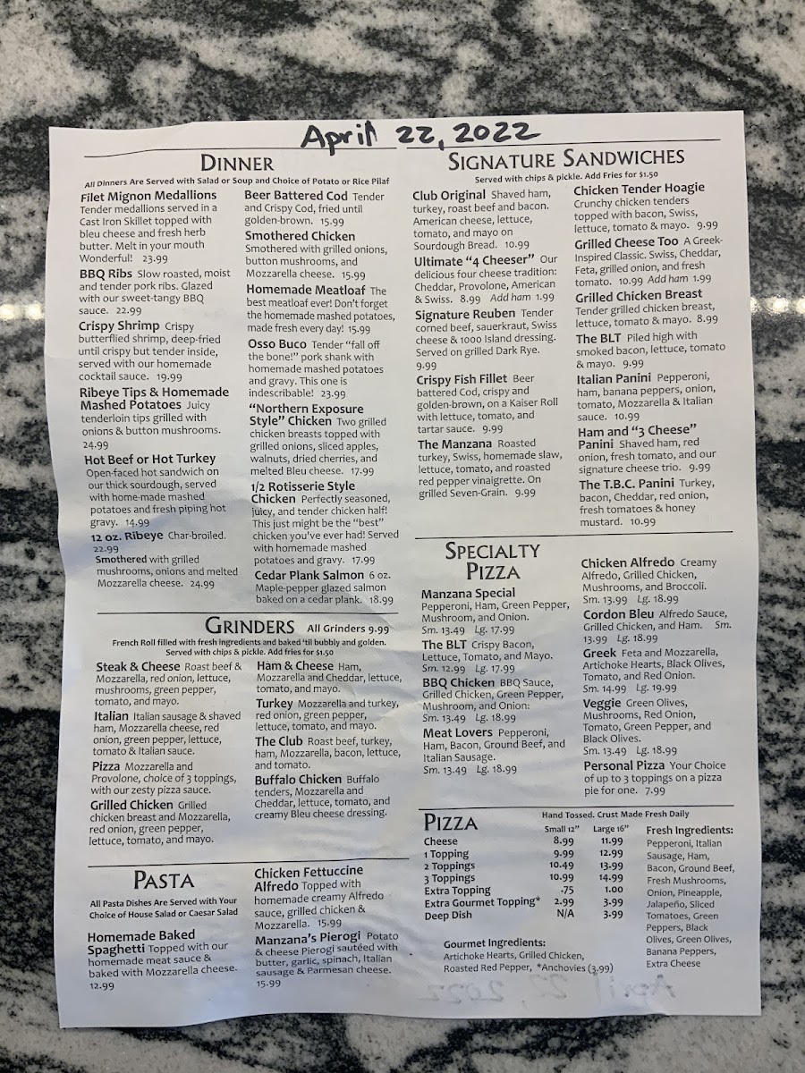 Welcome to Manzana's Restaurant, a hidden gem located at 4068 Michigan Ave in Onaway, MI. This charming spot offers a delightful menu that features fresh salads, signature sandwiches, and mouthwatering pizzas to satisfy every palate.